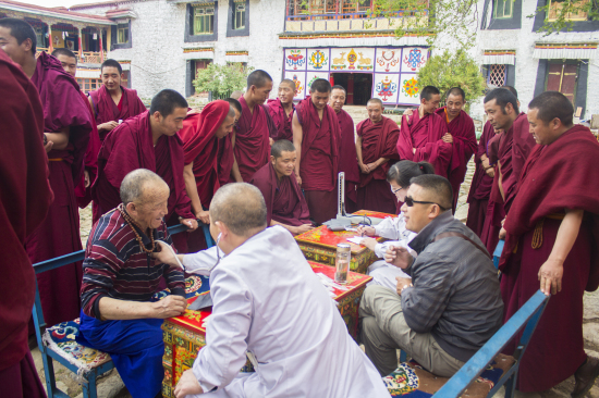 義診現(xiàn)場,醫(yī)療隊熱情接待每一位前來就診或咨詢的僧侶,為其看病、發(fā)放藥品及講解日常健康知識和自我保健的方法,僧侶們也由一開始的只是駐足觀望轉為積極上前就診,并主動向醫(yī)療隊闡述自己的病狀,同時針灸科李泉濤醫(yī)生更是不間斷地為多位經(jīng)常久坐寺中的僧侶推拿與按摩頸、肩、腰、腿等各個部位。中午時分,醫(yī)療隊還受邀與僧侶們一起吃齋飯。