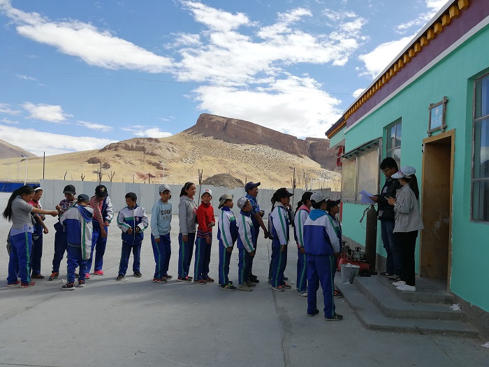 我跟隨劉冬梅醫(yī)生組前往革吉縣初級中學(xué)進(jìn)行篩查工作,學(xué)生們在班主任的帶領(lǐng)下,排著整齊的隊伍,填寫資料、做B超、抽血留樣,秩序井然。