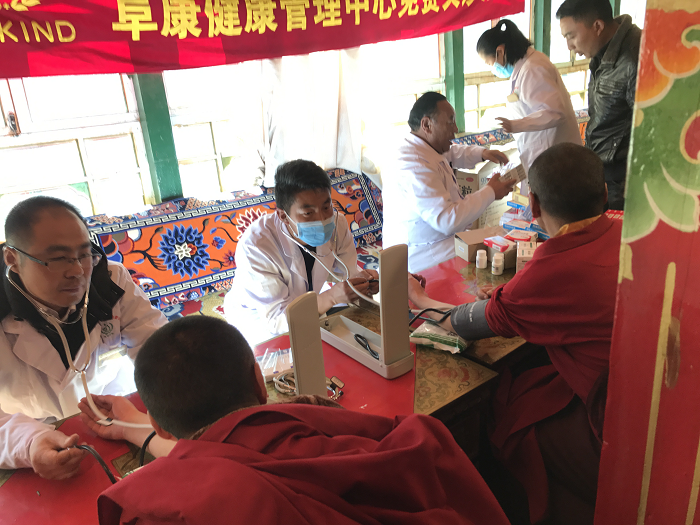 隨后,義診活動(dòng)井然有序地開始了,張?jiān)洪L和田豐輝醫(yī)生負(fù)責(zé)測血壓,護(hù)士唐宗青測血糖,瓊瑪負(fù)責(zé)發(fā)放藥品,占堆(我院體檢中心醫(yī)務(wù)人員)對每一位血壓、血糖高的僧人、群眾進(jìn)行登記,有利于以后對他們的健康進(jìn)行隨訪跟蹤,了解他們有無不適以及血壓、血糖情況,督促他們的按時(shí)服藥、并指導(dǎo)他們健康的生活方式。在義診體檢過程中,一名76歲的老人,血壓200/120mmHg,經(jīng)過詢問,老人身體并沒有不適,在詳細(xì)的給老人講解了高血壓對身體健康的影響,以及高血壓帶來的危害后,并給予老人免費(fèi)發(fā)了治療高血壓的藥物,囑咐他這幾天要每天規(guī)律服用降壓藥物、監(jiān)測血壓,直至血壓在正常范圍后可以改為三到五天測一次血壓,但降血壓藥物不能停止,老人欣然接受意見,并握手致謝。