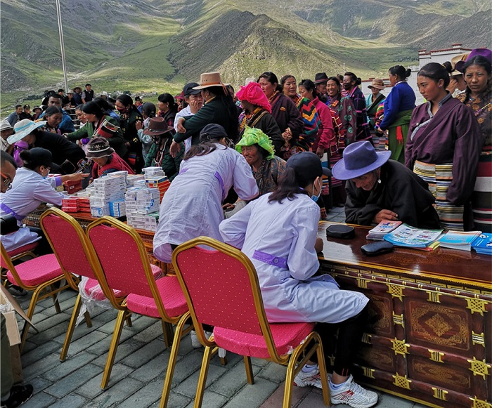 當天上午,全國婦聯(lián)宣傳部、自治區(qū)婦聯(lián)、拉薩市婦聯(lián)、那曲市婦聯(lián)一行來到安置點為群眾贈送了藏漢雙語書籍。阜康義診工作隊也來到現(xiàn)場為安置點居民量血壓、檢查病情并詢問身體情況,耐心細致地為群眾分析病情、講解日常衛(wèi)生保健、合理用藥等衛(wèi)生常識,認真解答關于常見病、多發(fā)病的預防診治及愈后注意事項。僅一個上午時間就為100余名安置點群眾開展了問診、聽診、答疑、測血壓和健康知識宣傳,免費發(fā)放各類藥品價值4萬余元 。