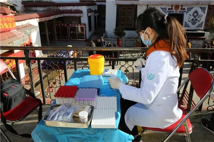 上午8點(diǎn),朱主任一行人分別從阜康婦產(chǎn)兒童分院和阜康健康體檢中心兩路出發(fā),經(jīng)過(guò)一個(gè)多小時(shí)的路途顛簸,于9點(diǎn)15分到達(dá)雄色寺,尼眾和駐寺干部們?cè)缫训群蛟谒聫R庭院內(nèi)。由于體檢項(xiàng)目中有血液檢查,不能進(jìn)食,為了不讓尼眾和干部們?nèi)甜囂茫熘魅我恍腥说竭_(dá)雄色寺以后,快速整理現(xiàn)場(chǎng),將所用儀器與藥品一一擺放整齊,在區(qū)婦聯(lián)領(lǐng)導(dǎo)講話以及受邀律師宣講完畢以后,立刻投入為各位尼眾與干部體檢的工作當(dāng)中。