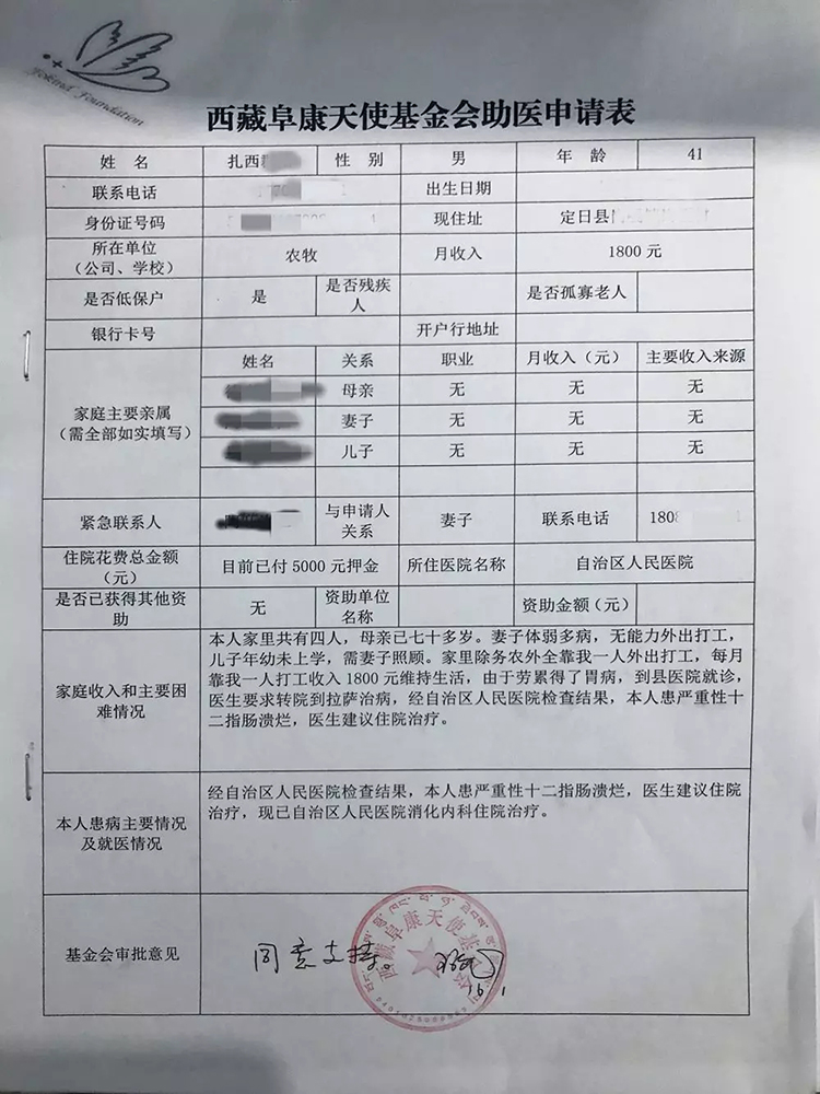 據(jù)了解,扎西因勞累患上胃病,在縣醫(yī)院的建議下轉(zhuǎn)至自治區(qū)人民醫(yī)院治療,經(jīng)自治區(qū)人民醫(yī)院檢查確診為:十二指腸潰瘍,建議入院治療。但扎西的家庭十分困難,妻子體弱多病,全家僅靠扎心每月打工收入1800元維持生活,無(wú)力支付醫(yī)療費(fèi)用。在社會(huì)好心人士的介紹下,向阜康天使基金會(huì)提出了助醫(yī)申請(qǐng)。