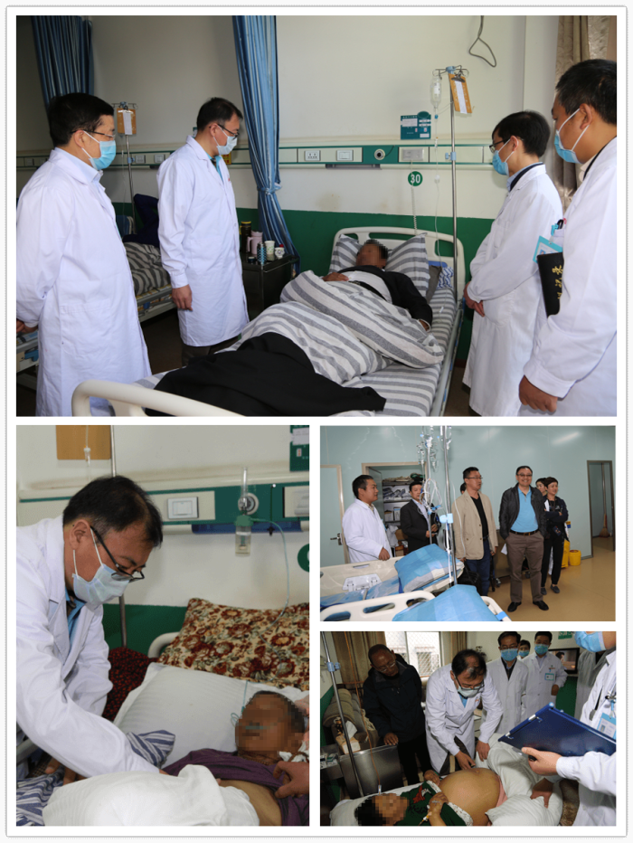 在阜康醫(yī)院住院部,周平紅教授一行換上工作服和阜康醫(yī)院消化內(nèi)科醫(yī)護人員一起查房。在44號尼珍的病床前,周平紅教授詳細詢問病人的生理、病理指標,阜康醫(yī)院醫(yī)護人員一一詳細回答。之后,周平紅教授走到病床前對患者的體征狀況進行了仔細檢查,并向家屬詢問病人的實時病況。周平紅教授還來到89歲的患者扎西、離退休人員格桑的病床前,詢問了病人的各項指標并仔細進行了體征檢查。