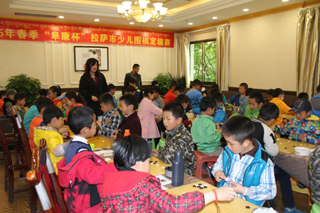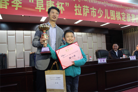 3月25日比賽結(jié)束后“復(fù)康杯”少兒圍棋定級(jí)賽頒獎(jiǎng)儀式開(kāi)始,拉薩棋院院長(zhǎng)王斌、西藏阜康醫(yī)藥發(fā)展有限公司總經(jīng)理劉瀟瀟、西藏阜康醫(yī)藥發(fā)展有限公司總經(jīng)理陳彬、拉薩棋院圍棋部副主任趙鈞以及棋院老師陳學(xué)滸、袁文琴出席了本次會(huì)議。 王斌院長(zhǎng)在頒獎(jiǎng)儀式表示,很高興能夠舉辦拉薩市首屆“阜康杯”少兒圍棋定級(jí)賽,他向比賽獲勝者表示衷心的祝賀,希望他們能再接再厲繼續(xù)學(xué)習(xí)圍棋。他了解到很多家長(zhǎng)對(duì)拉薩市棋院選址郵政賓館非常滿意,這里環(huán)境清幽,非常適合教學(xué),他當(dāng)場(chǎng)表示郵政賓館二樓已經(jīng)被棋院斥資180萬(wàn)元租賃6年,至少在6年以內(nèi)棋院不會(huì)從新選址。王斌表示,目前,拉薩棋院正在向上級(jí)有關(guān)部門申請(qǐng)圍棋段位資格證的相關(guān)事宜,如無(wú)意外,預(yù)計(jì)在今年年底能夠申請(qǐng)成功,完成圍棋段位資格證的申請(qǐng),不僅能給我區(qū)圍棋事業(yè)的發(fā)展帶來(lái)很大的幫助同時(shí)也能讓我區(qū)更多的圍棋愛(ài)好者參與到此次項(xiàng)目。