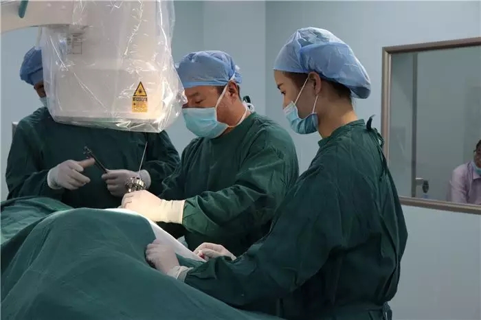 13:00時,徐鑫一行來到病房,對即將接受手術(shù)的患者進(jìn)行術(shù)前評估,看過核磁共振和CT檢查資料,通過交流討論最終確定了手術(shù)方案。13:35分患者被推進(jìn)手術(shù)室,本次手術(shù)由徐鑫和阜康醫(yī)院骨科醫(yī)師李延軍共同完成。手術(shù)運(yùn)用BEIS技術(shù),在定位階段專家們多次透視確保儀器直達(dá)患處,以確保摘除髓核準(zhǔn)確無誤、減少患者創(chuàng)傷。髓核摘除后,患者疼痛麻木感隨即消失,手術(shù)圓滿成功,16:25分患者被推出手術(shù)室,專家嚴(yán)謹(jǐn)細(xì)致的作風(fēng)以及精湛的技術(shù)贏得醫(yī)務(wù)人員的掌聲。椎間孔鏡微創(chuàng)手術(shù)的重點(diǎn)在于透視定位,只有精準(zhǔn)定位才能保證準(zhǔn)確摘除髓核,減少患者疼痛與創(chuàng)傷。