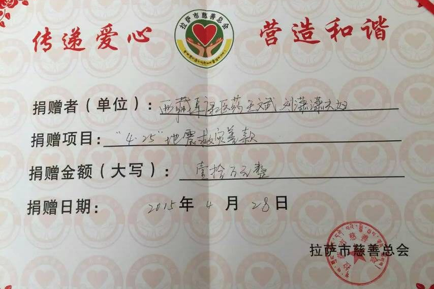 在西藏,哪家有災(zāi)哪家有難,在王斌董事長知情的情況下,都會(huì)伸出援助之手,這次尼泊爾地震,除了醫(yī)院募捐的現(xiàn)金205682元外,王總私人還拿出了十萬元捐贈(zèng)給災(zāi)區(qū),希望自己的綿薄之力能助災(zāi)區(qū)人民早日走出陰霾。