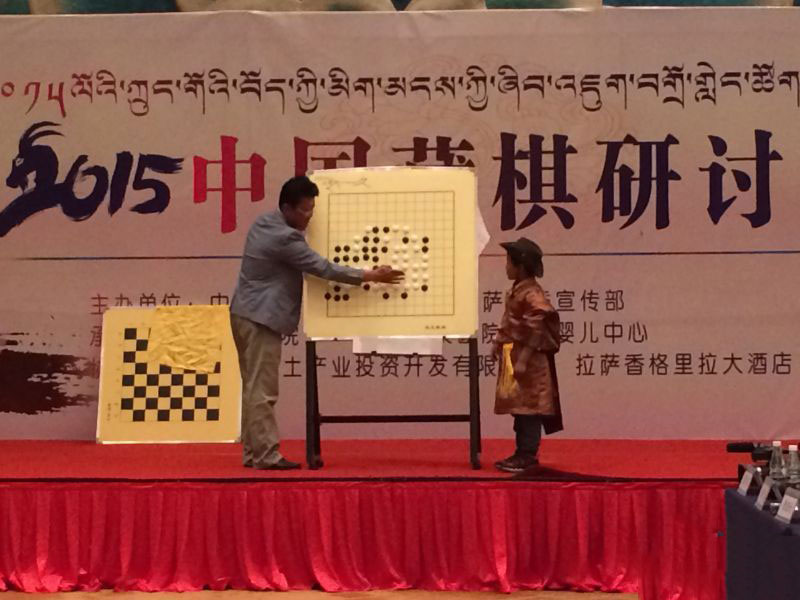 11月7日上午10時(shí)30分,2015中國(guó)藏棋研討會(huì)在香格里拉大酒店1號(hào)宴會(huì)廳開(kāi)幕,阿旺邊巴老師現(xiàn)場(chǎng)講解藏棋歷史沿革、發(fā)展分布概況及藏式圍棋(密芒)、久、國(guó)王與大臣等藏棋介紹。并與現(xiàn)場(chǎng)人員互動(dòng)演繹“國(guó)王與大臣棋”、“魚(yú)棋”等。