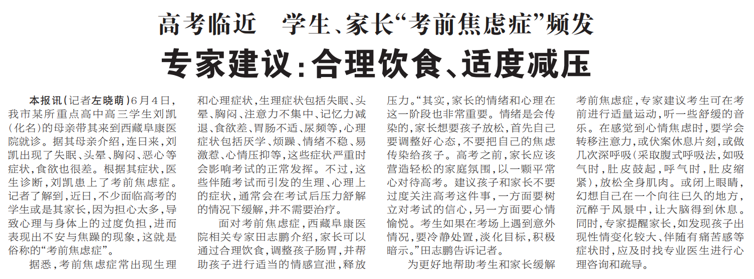 面對(duì)考前焦慮癥,西藏阜康醫(yī)院相關(guān)專家田志鵬介紹,家長(zhǎng)可以通過合理飲食,調(diào)整孩子腸胃,并幫助孩子進(jìn)行適當(dāng)?shù)那楦行?,釋放壓力?ldquo;其實(shí),家長(zhǎng)的情緒和心理在這一階段也非常重要。情緒是會(huì)傳染的,家長(zhǎng)想要孩子放松,首先自己要調(diào)整好心態(tài),不要把自己的焦慮傳染給孩子。高考之前,家長(zhǎng)應(yīng)該營(yíng)造輕松的家庭氛圍,以一顆平常心對(duì)待高考。建議孩子和家長(zhǎng)不要過度關(guān)注高考這件事,一方面要樹立對(duì)考試的信心,另一方面要心情愉悅??忌绻诳紙?chǎng)上遇到意外情況,要冷靜處置,淡化目標(biāo),積極暗示。”田志鵬告訴記者。