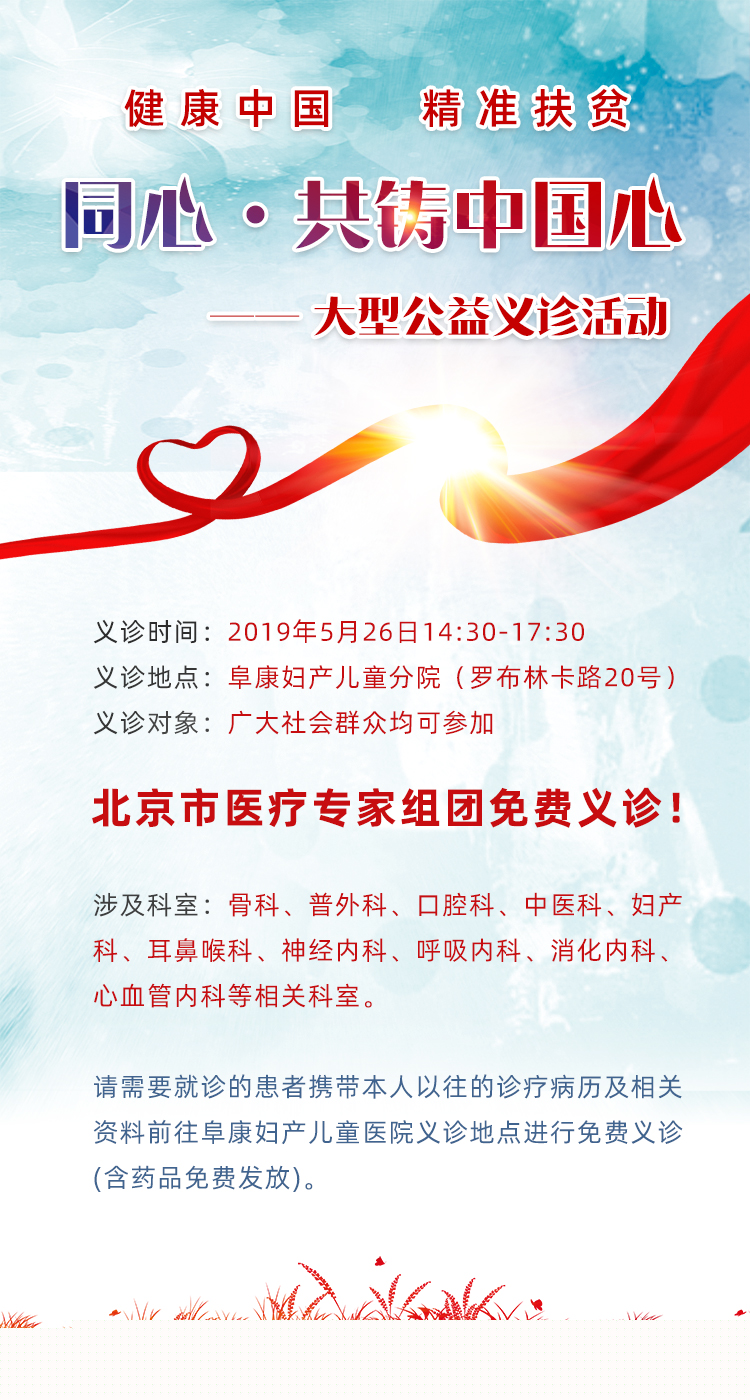 經(jīng)西藏自治區(qū)政府的大力支持與協(xié)調(diào),“同心·共鑄中國(guó)心”大型公益義診活動(dòng)于5月26日14:30-17:30在阜康婦產(chǎn)兒童醫(yī)院開(kāi)展,此活動(dòng)由中共中央統(tǒng)戰(zhàn)部指導(dǎo),助力“健康中國(guó)”“精準(zhǔn)扶貧”國(guó)家戰(zhàn)略,促進(jìn)“邊疆民族”地區(qū)醫(yī)療衛(wèi)生事業(yè)發(fā)展,是以疾病救治為核心進(jìn)行的大規(guī)模定點(diǎn)、定向主題公益活動(dòng)。