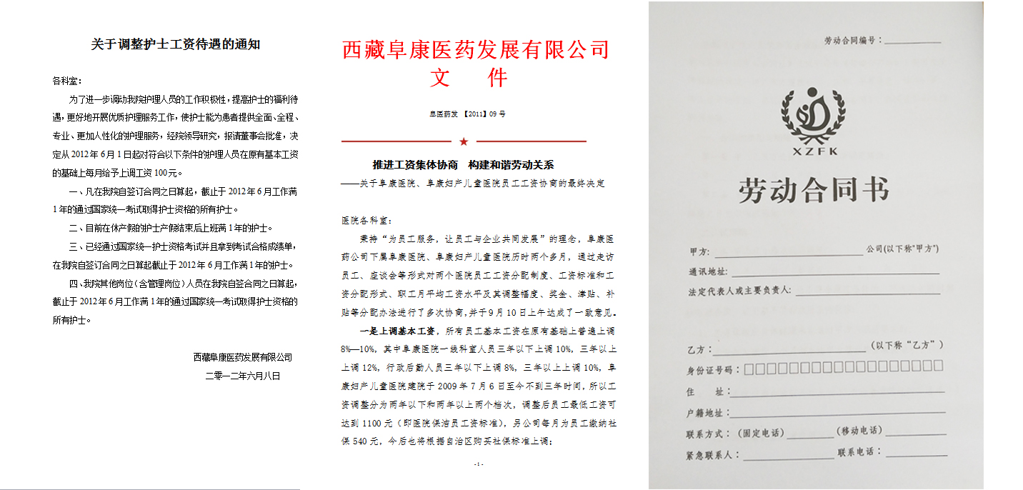 關(guān)于調(diào)整護(hù)士工資待遇的通知(左一)、推進(jìn)工資集體協(xié)商 構(gòu)建和諧勞動(dòng)關(guān)系(左二)、勞動(dòng)合同書(shū)(右一)