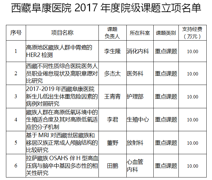 這是我院首次組織申報并批準立項的院級課題。課題主持人均為我院醫(yī)務人員。本年度立項資助的6個課題均為院級重點課題,每項課題將提供10萬元的研究經(jīng)費。課題自2017年10月1日正式實施,期限為兩年。