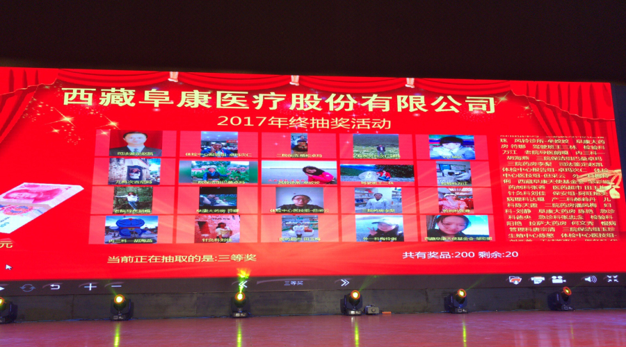 抽獎環(huán)節(jié)更是讓年會進入高潮,帶動了全場同仁,1000多張個人照在大屏幕上不停滾動著,隨著一聲聲地叫停,畫面一幕幕定格,一批又一批幸運兒誕生了,歡呼聲、笑聲、掌聲、吶喊聲此起彼伏,匯成歡樂的海洋,為獲獎?wù)咦8#瑸樽约鹤8?,為阜康來年會更好而祝福!剛參加?ldquo;拉薩市政協(xié)會議”的陳彬副總經(jīng)理也在第一時間趕到現(xiàn)場與大家聯(lián)歡,并為大家抽取今天的一等獎,大家翹首以盼,現(xiàn)場氣氛頓時沸騰起來。本次共抽出三等獎200名,二等獎50名,一等獎20名。