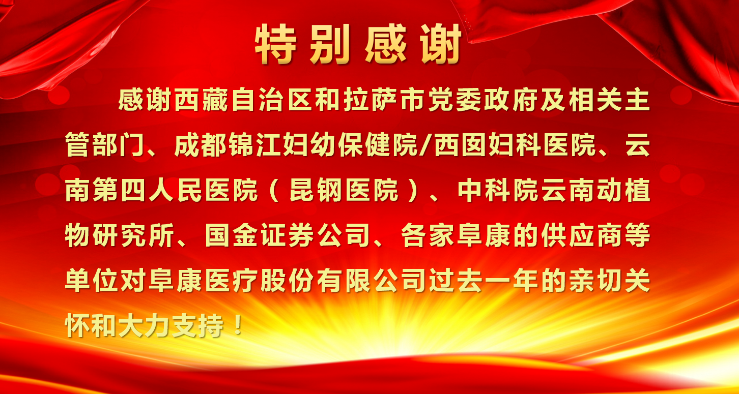 我之存在,因為有你;百年阜康,感恩有您。感恩是一種態(tài)度、一種美德、一種情懷!不忘初心、砥礪前行,感謝你們的一路陪伴,阜康的輝煌離不開每一位阜康人的奉獻,雄關(guān)漫道真如鐵,而今邁步重頭越!2018年將是阜康騰飛的一年,在各級領(lǐng)導(dǎo)關(guān)心下,各位同仁支持下,阜康一年更比一年好!以十九大精神為指導(dǎo),努力打造“團結(jié)、創(chuàng)新、規(guī)范、節(jié)約、用心”五位一體的現(xiàn)代化醫(yī)院!為西藏人民群眾解決看病遠、看病難、看病貴的問題,全心全意為西藏人民健康服務(wù)!