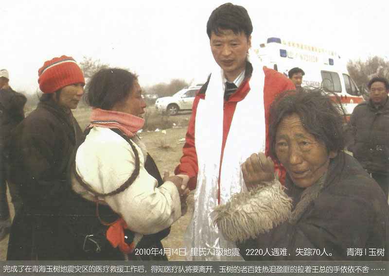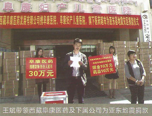 2008年5月12日14時(shí)28分,在得知發(fā)生在四川汶川8級(jí)的強(qiáng)烈地震后,王斌被深深的震撼了,5月13日第一時(shí)間帶頭捐款并號(hào)召全公司347名員工為災(zāi)區(qū)人民獻(xiàn)愛心,在王斌的帶領(lǐng)下短短的一上午公司即向西藏紅十字會(huì)捐款10062萬元(其中王斌個(gè)人捐款5062萬元)。13日下午,王斌隨即召開阜康醫(yī)院醫(yī)務(wù)人員趕赴災(zāi)區(qū)醫(yī)療救援動(dòng)員大會(huì),并迅速組建了一支由他本人作為領(lǐng)隊(duì)的26人醫(yī)療救援隊(duì)。同時(shí)他還帶領(lǐng)醫(yī)療隊(duì)為盡快抵達(dá)地震災(zāi)區(qū)并第一時(shí)間參與醫(yī)療救援,而且決定在成都臨時(shí)購買一輛配備完善的救護(hù)車,還包括大量藥品、生活物品、以及部分醫(yī)療設(shè)備,此次救災(zāi)共投入130余萬元。