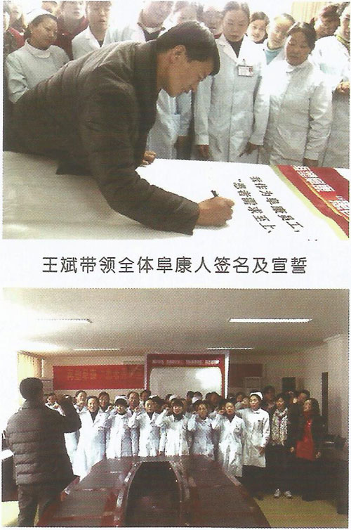 當(dāng)日下午,筆者在兩家醫(yī)院看到,西藏阜康醫(yī)藥超市和兩家醫(yī)院的全體醫(yī)護(hù)人員乃至醫(yī)院的保安都在“患者需求至上,團(tuán)隊(duì)精誠協(xié)作”的大型橫幅上簽上了自己的姓名。王斌董事長說:為了讓醫(yī)院全體人員時(shí)刻牢記“病人至上”的理念,通過簽名的方式時(shí)刻刺激醫(yī)院員工服務(wù)意識的神經(jīng),從而達(dá)到“服務(wù)來自于心”的效果。
