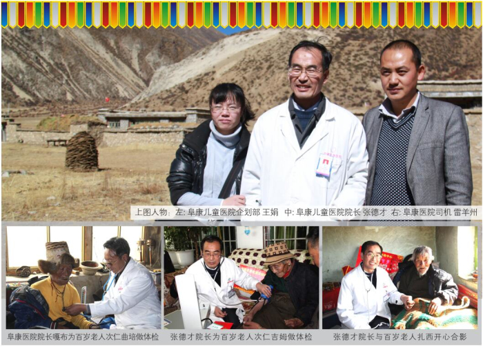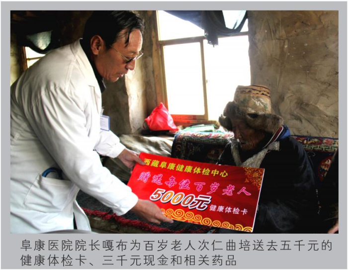 西藏高寒缺氧,自然環(huán)境惡劣。60多年前,這里的人均壽命才35.5歲。然而到了2012年,光拉薩的七縣一區(qū)就有16位百歲老人,正是這些百歲老人,見證了西藏翻天覆地的巨變,他們是全社會的寶貴財富,更是西藏從貧窮落后走向繁榮富強的親歷者、見證者。在全國人民喜迎黨的十八大勝利召開之際,西藏阜康(國際)健康體檢中心與拉薩市民政局老齡辦組織發(fā)起了“關(guān)愛百歲老人行動”。此次行動歷時16天,里程2000多公里,尋訪了拉薩七縣一區(qū)十一位百歲老人,不僅為每位老人送上了精心準備的三千元現(xiàn)金、五千元健康體檢卡、一個便攜式氧氣瓶、一個便攜式血壓儀,還為他們送上了免費義診和相關(guān)藥品。王斌董事長參加了此項活動的啟動儀式,嘎布院長、張德才院長親自帶隊為每一位百歲老人做了常規(guī)的身體檢查,并送上了藥品和祝福。