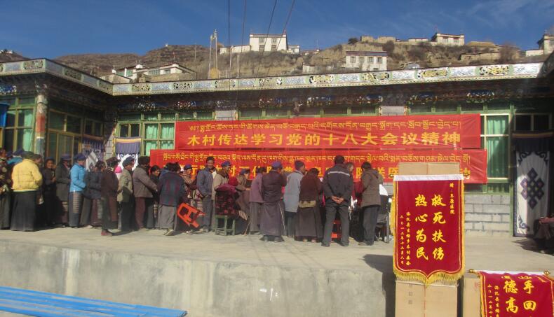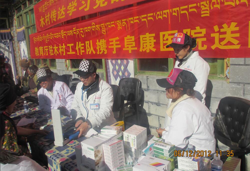 當?shù)氐鸟v村干部,生格鄉(xiāng)政府、生格鄉(xiāng)衛(wèi)生院的領導接待了我們,得知我們趕路沒來得及吃早餐,特意煮了粥,炒了雞蛋和僅有的幾顆青菜。在他們的組織下,木村的百姓在村委會的院子里排起了長長的候診隊伍。院子里擺好了桌子、凳子,算是簡易的診斷臺,我負責測血壓、了解病情,護士小楊負責發(fā)藥,心電圖和B超由小張負責做,當?shù)匦l(wèi)生院的吳金院長,以及醫(yī)生達次給我們當翻譯。