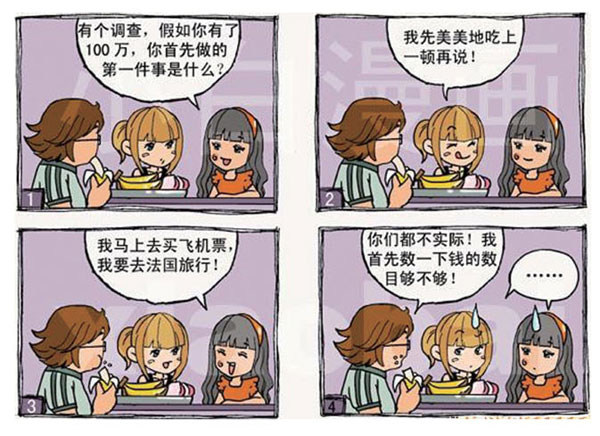 有一個(gè)富婆帶著自己的狗在街上走。經(jīng)過天橋時(shí)看見一個(gè)乞丐,她便一心去奚落一下他。她走過去說:“你對(duì)我的狗叫一聲爸,我就給你100元。”氣丐說:“要是我叫10聲呢?”富婆不耐煩地說:“笨蛋,那不就是1000元嘍。”于是,氣丐就對(duì)著富婆的狗叫:“爸,爸,爸,爸,爸,爸,爸,爸,爸。”周圍的人都來觀看,那位富婆從手袋里拿出900元給他。于是,那位乞丐對(duì)著富婆說:“謝謝,媽!”