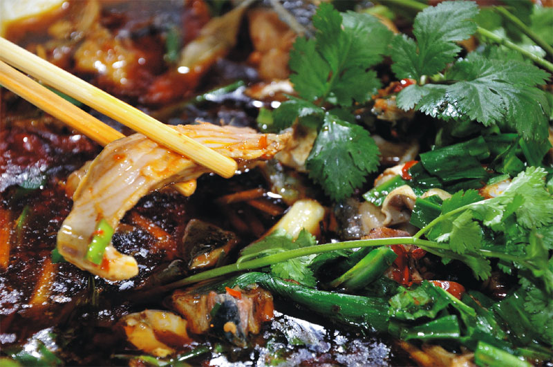廣東人喜歡煲湯,卻把老火湯里豐富的湯料稱為湯渣,一般只作為正菜前的消遣而已。四川人的燉菜則是絕對(duì)的主角,無論是家里的餐桌還是飯店的酒席,一般上了燉菜,也就意味著宴席進(jìn)入高潮。過去,家里最喜歡做海帶燉雞,老母雞加海帶,拍幾片生姜,扔一束香蔥,快起鍋的時(shí)候?yàn)⒁恍},湯清肉香,老遠(yuǎn)聞到就忍不住想去揭一下鍋蓋。那時(shí),我最得意的是用小碟子,只放一些干辣椒粉和鹽,舀一小勺雞湯拌勻了,做成蘸水,隨手揭一塊雞皮在蘸水里一裹,滋味純粹而濃烈,讓人每次想起,都忍不住要閉上眼睛猛吸一口氣,仿佛那味道又在舌尖上打轉(zhuǎn)。
