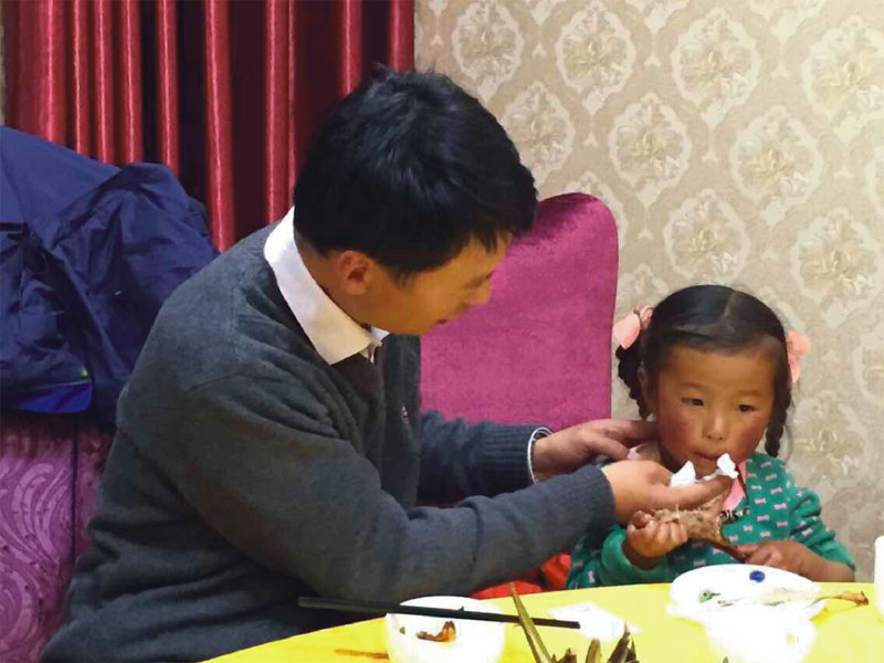 和小卓瑪?shù)臅r(shí)光是快樂(lè)而短暫的,剛相聚時(shí),你是那么膽小怕生的,“阿爸”為你穿上新衣服,你開(kāi)心。“阿爸”對(duì)你是那么疼愛(ài)、牽掛,把你緊緊抱在懷里,為你剝糖紙,為你卷衣袖,帶你進(jìn)城看震后城市的新貌,帶你吃大餐,為你擦鼻涕,為你拿你喜愛(ài)吃的肉,為你擦手上衣服上的油漬,帶你嬉戲歡天喜地,逗你開(kāi)心,此時(shí)的他,已不再是擁有八百多號(hào)員工的企業(yè)董事長(zhǎng),他就是你的“阿爸”,一個(gè)認(rèn)為和你在一起時(shí)光太短的“阿爸”。