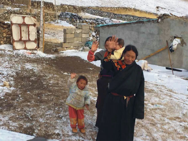 車子越來(lái)越近,透過(guò)車窗,遠(yuǎn)遠(yuǎn)白雪寒風(fēng)中,早已屹立著高矮大小幾人,是奶奶、媽媽、舅舅和天真的你,手捧著圣潔神圣的黃色哈達(dá),似盼望著許久不見(jiàn)的家人的歸來(lái),車外的寒風(fēng)很冷,有點(diǎn)刺骨。見(jiàn)到親人的到來(lái),奶奶急忙上前為他獻(xiàn)上祝福吉祥的哈達(dá)并雙手合十置于額上,隨后牽過(guò)身旁的女孩——玉康卓瑪,個(gè)子不高,比同齡孩子稍消瘦矮小,一張稚嫩的蘋(píng)果臉蛋兒上深深的高原紅,給人留下深刻印象。他滿懷憐愛(ài)地抱起了玉康卓瑪,年僅4歲的她并不會(huì)說(shuō)漢語(yǔ),更是未曾見(jiàn)過(guò)他,可愛(ài)害羞甚至有點(diǎn)怕生的小卓瑪卻對(duì)著他喊了聲“阿爸”。此時(shí),奶奶正在為次仁(我們同行的伙伴,是當(dāng)時(shí)參加玉樹(shù)抗震救災(zāi)且參與了接生小卓瑪?shù)淖o(hù)士之一)獻(xiàn)哈達(dá)。瞬間,空氣似乎凝固了幾秒,突然,奶奶兩行淚水徑直流了下來(lái)。此情此景觸人心懷,兩兩相擁,無(wú)聲地流著熱淚。是感恩,是親人,是多年來(lái)他一直履行承諾的感激,是為他不畏千里迢迢尋找來(lái)看望的感動(dòng),如同失散多年的親人再度相逢。