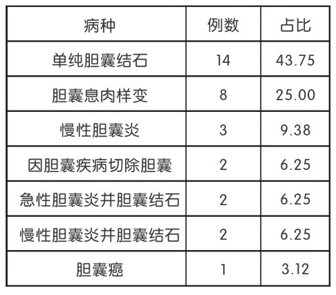273名體檢者中241例未見(jiàn)明顯膽囊異常,占比為88.28%,32例查出膽囊疾病,占比為11.72%。32例膽囊疾病中單純膽囊結(jié)石比例最高,為14例,占比43.75%;膽囊息肉樣變占比第二,為8例,占比2500%;其他10例中,3例為慢性膽囊炎(9.38%),2例為因膽囊疾病切除膽囊(6.25%),2例為急性膽囊炎并膽囊結(jié)石(6.25%),2例為慢性膽囊炎并膽囊結(jié)石(6.25%),1例為膽囊癌(3.12%),具體見(jiàn)下表。