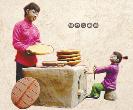 鍋盔在陜西可是隨處可見。它可是面食中的又一經(jīng)典。相傳唐代修乾陵時(shí),因服役的軍人工匠人數(shù)過多,往往為吃飯而耽誤施工進(jìn)度,受到懲罰。于是,有一士兵在焦急之中便把面團(tuán)放進(jìn)頭盔里,把頭盔放到火中去烤而烙成餅,這便有了鍋盔一說。