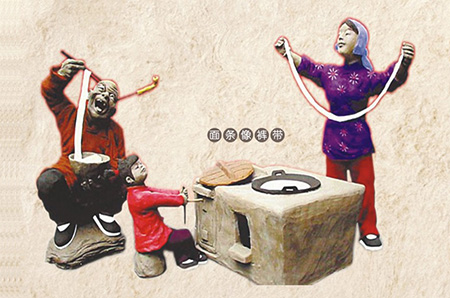這做面條的功夫在那揉面的一關(guān),沒有揉到的面,見了開水馬上就成了塊狀,再經(jīng)水一煮,出來就是稀糊糊了。所以,這個(gè)面條的長(zhǎng)短也是能看出這個(gè)媳婦的手藝和心計(jì)的,這也是陜西面條長(zhǎng)的一個(gè)原因。 每到中午吃飯時(shí)間,村子里的男人都端了個(gè)大碗出來,聚在一起,用筷子挑,香香的吸,然后大家一起評(píng)說誰家的媳婦手藝好,被夸的男人總是謙虛的說:“這算個(gè)啥嘛!”其實(shí)心里像蜜樣甜,而落了下風(fēng)的男人回家少不了罵那懶婆娘幾句。關(guān)中面條以武功、楊凌、乾縣、扶風(fēng)、岐山為最好,由于當(dāng)?shù)厥炒揍勗飒?dú)特,先后有了武功縣的長(zhǎng)寧醋和岐山醋比較有名,因此面里放醋必不可少,所謂“酸面咸攪團(tuán)”。