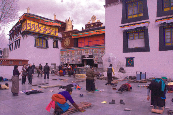 前幾天在大昭寺廣場,看人們磕長頭。人很多,其中多數(shù)應該是牧區(qū)上來的,臟亂的衣服,掩不住滿眼的虔誠。有的人累了,便坐在那里和身邊的一或兩人輕聲地說話,大多數(shù)人,則是重復著相同的動作:面向大昭寺,不停起身,然后跪倒全身俯地……從早到晚,日復一日,簡單而長久。