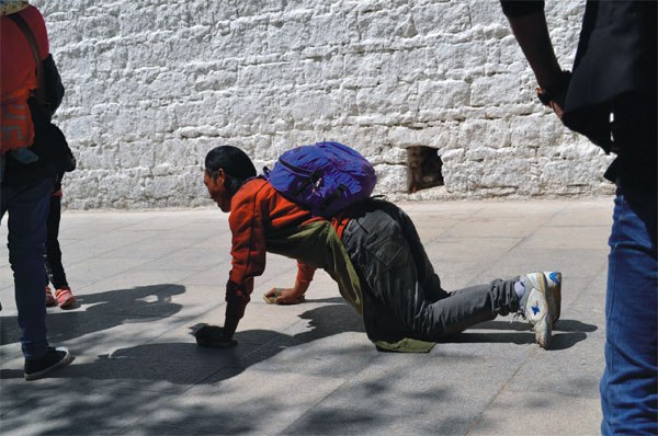 對于磕長頭,很容易讓人想起倉央嘉措的詩:那一天,閉目在經殿香霧中,驀然聽見,你誦經中的真言;那一月,我搖動所有轉經筒,不為超度,只為觸摸你的指尖;那一年,磕長頭匍匐在山路,不為覲見,只為貼著你的溫暖;那一世,轉山轉水轉佛塔,不為修來生,只為途中與你相見。