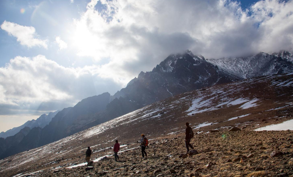 路越來越難走,全部是泥塘亂石,一側(cè)身就是驚心寒膽的高崖深壑,不過我們幾個(gè)似乎都走得行云流水,一點(diǎn)也沒有懼意,腦子里只浮動(dòng)著“不斷前進(jìn)”這一一個(gè)意念,以至于后來疲憊、寒冷、疼痛都已無知無覺,只是機(jī)械地儀式般地跟著前面的人前走、前走.....我想前面兩位體力強(qiáng)大的大哥應(yīng)該比我倆輕松許多,我倆真是每走一步都在接近自己的極限,特別是C,我?guī)缀跄芨杏X到他每一步、每- -步走下來的那種顫栗的殘破的不懈持守的意志,所以總走在他看得見我的地方。螞蝗倒是少了一些,只要不在上半身的,都沒有氣力去搭理了。