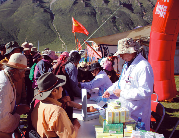 七月賽馬節(jié)期間,應(yīng)嘉黎縣縣政府及申扎縣縣委縣政府的真誠邀請。2015年7月25日,西藏阜康醫(yī)院義診隊帶著醫(yī)院的囑托、8萬元的藥品分別向嘉黎縣、申扎縣出發(fā)。7月26日,賽馬場里人頭攢動,熱鬧非凡。在西藏阜康醫(yī)院義診點,在工作人員的維持下,大家排起了長隊,自覺有序地等待著專家給他們診治。專家們?yōu)槿罕姕y量血壓、診斷病情,耐心解答他們的提問,同時就高原常見病、多發(fā)病的防治知識進行了認真講解,增強了群眾的自我保健意識。