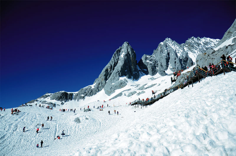 人文的掃興,索性來場自然之旅。第二天一大早我們就前往了玉龍雪山,還是被告知到達最高峰的索道票昨日售盡,我們的索道只到得了松杉坪。回憶起來,這也許值得慶幸。松杉坪松樹高聳如云,木棧道旁有積雪未化,風(fēng)過樹梢的積雪隨風(fēng)灑落,偶爾有小松鼠一躍而過,牦牛悠閑自在的吃著草,遠處是玉龍雪山的最高峰,仿佛近在咫尺。我想所有的生生死死都應(yīng)該在這里戛然而止,所有浮躁的靈魂都應(yīng)該在這里接受洗禮,進入輪回,拋卻紅塵暫享這片刻的永生。她是我去過最接近天堂的地方,
