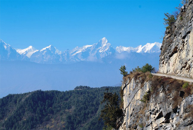 前幾天山里一直在下雨,因此道路濕滑,并不好走,我們拄著登山杖,走得很小心,卻仍然免不了摔跤。最初天空陰沉沉的,山間的霧濃得化不開(kāi),大家心里免不了有點(diǎn)沮喪,難道這次我們也要帶著遺憾離開(kāi)嗎?慢慢地,太陽(yáng)從云層間透出一點(diǎn)點(diǎn)光芒,雖然微弱,卻帶給我們莫大的希望??伤駛€(gè)調(diào)皮的孩子一樣,給你扮個(gè)鬼臉后,一會(huì)兒又消失不見(jiàn)了。心情再次低落起來(lái),埋著頭一個(gè)勁兒往上沖,期望著到了山頂就能是好天氣。誰(shuí)知這幸運(yùn)來(lái)的如此之快,走到一半時(shí),山里的霧開(kāi)始逐漸散開(kāi),遠(yuǎn)處的雪山一點(diǎn)點(diǎn)顯現(xiàn)出來(lái),就像那害羞的姑娘,在千呼萬(wàn)喚下終于揭開(kāi)它那神秘的面紗,雪山連綿不斷,一座接著一座,最引人注目的便是貢嘎群山,它們似乎觸手可及,卻又隔著濤濤云海。我們的激動(dòng)無(wú)以言表,原本已疲憊的身體立刻變得精神抖擻,因?yàn)榍胺竭€有更美的風(fēng)景等著我們。