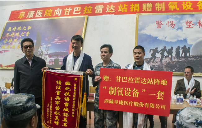 2016年5月11日,西藏阜康醫(yī)院有限公司向甘巴拉雷達(dá)站捐贈(zèng)制氧設(shè)備儀式在甘巴拉雷達(dá)站營(yíng)地舉行,西藏自治區(qū)政協(xié)副主席、區(qū)工商聯(lián)主席、區(qū)總商會(huì)會(huì)長(zhǎng)阿沛·晉源,區(qū)工商聯(lián)副主席劉洪,區(qū)工商聯(lián)政研室主任張?jiān)茖?,區(qū)工商聯(lián)經(jīng)聯(lián)處副處長(zhǎng)秦林,95662部隊(duì)政治委員楊壽保,甘巴拉雷達(dá)站政治教導(dǎo)員李再華,西藏阜康醫(yī)療股份有限公司黨委書記、董事長(zhǎng)王斌,黨委副書記、總院長(zhǎng)張德才,黨委紀(jì)檢委員、總經(jīng)理陳彬以及甘巴拉雷達(dá)站全體官兵等出席了本次捐贈(zèng)儀式。