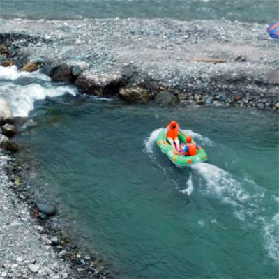 翌日,一大早醒來推開窗戶,便被外面的風(fēng)景迷住了。霧氣形成一道道白色的緞帶,披在了群山的肩上腰間。木樓的露天陽臺上,同事們都在不停的感嘆和拍照,亦有人在閉目養(yǎng)神,感受大自然的氣息。一起吃過早餐,車隊便駛向白沙河畔,開始了我們期待已久的重頭戲——虹口漂流。虹口漂流被譽為“西部第一漂”,全程近萬米,且落差明顯,不但能讓人享受“乘風(fēng)破浪,激情飛揚”的驚險樂趣,也能讓人感受到“遠(yuǎn)喧囂而返林、近山野而歸真”的生態(tài)魅力。自由漂的皮艇兩人一艇,經(jīng)過初步的適應(yīng)之后,不同皮艇上的同事們紛紛拿起水瓢,水槍,頭盔等互相潑灑起來,而岸邊的游客也不甘寂寞,拿起各種“武器”參與進(jìn)來。