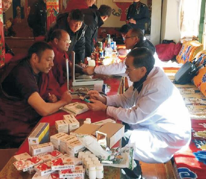 12月10日,在西藏阜康醫(yī)院名譽(yù)院長、慢病管理中心主任張德才的帶領(lǐng)下一行6人前往楚布寺,義診中張院長和田豐輝醫(yī)生負(fù)責(zé)測血壓,唐宗青測血糖,瓊瑪負(fù)責(zé)發(fā)放藥品,占堆對每一位血壓、血糖高的僧人、群眾進(jìn)行登記,張院長根據(jù)西藏人民的生活健康狀況,對來義診人員提出《健康五大基石》。
